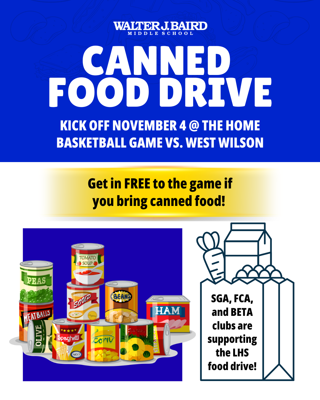 TONIGHT (11/4), if you bring canned food, you get into our home basketball game vs. West Wilson for free!